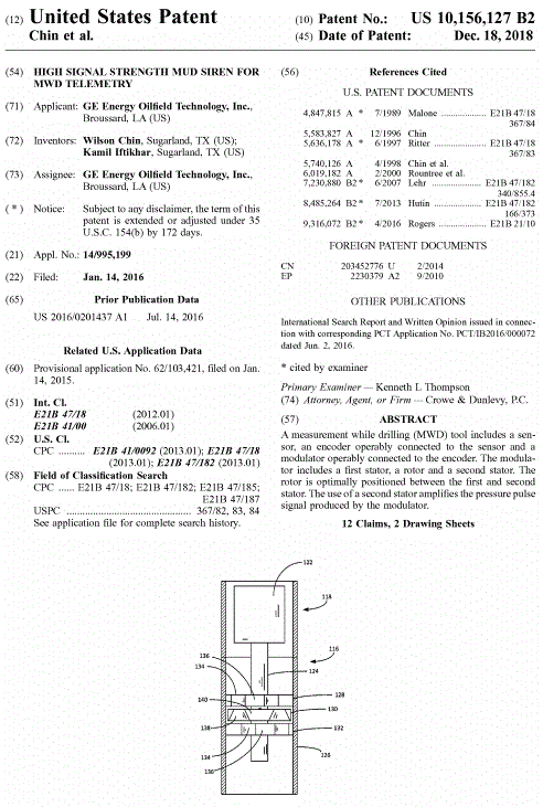 General Electric's wind tunnels at its Oklahoma Oil & Gas Technology Center and Shanghai, China locations are second to none. While we cannot divulge details, our latest patents above shed insight on "cool" MWD signal sources to come. The above inventions disclose a new siren that, for like rotation and flow rates, produces twice the signal found in existing sirens and simu, implying high data-rate and deep hole capabilities.